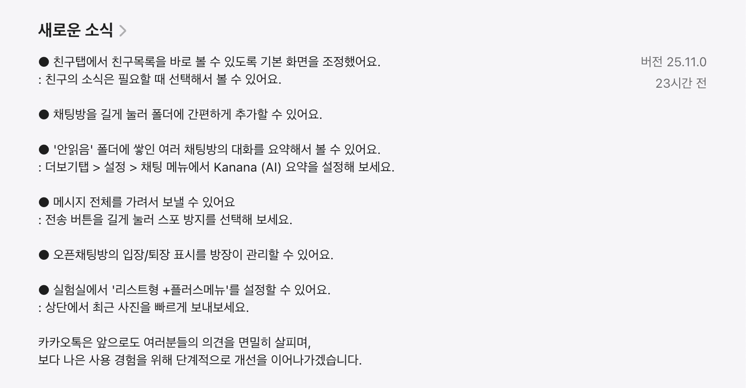 이 변화는 카카오가 이용자 의견을 수렴하고, 서비스 본질에 집중하기 시작했다는 긍정적인 신호로 볼 수 있습니다. 👏